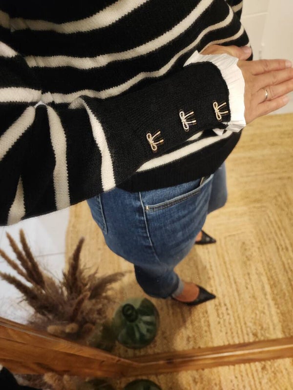 Pull marinière avec col chemise et bordure de manches, détails de boutonnière doré sur les poignets. C est un pull fluide très agréable à porter.