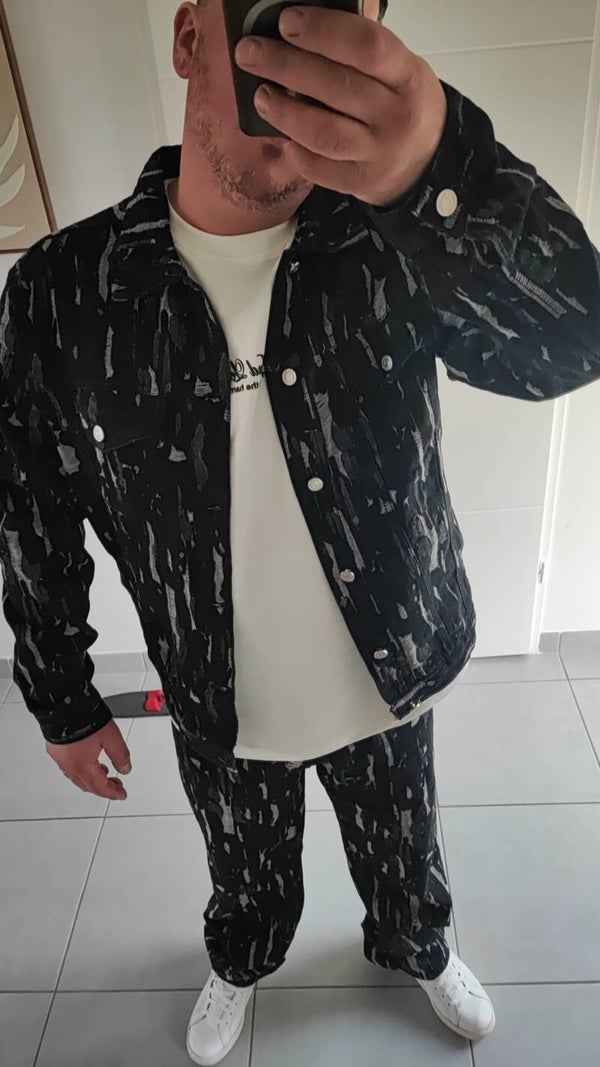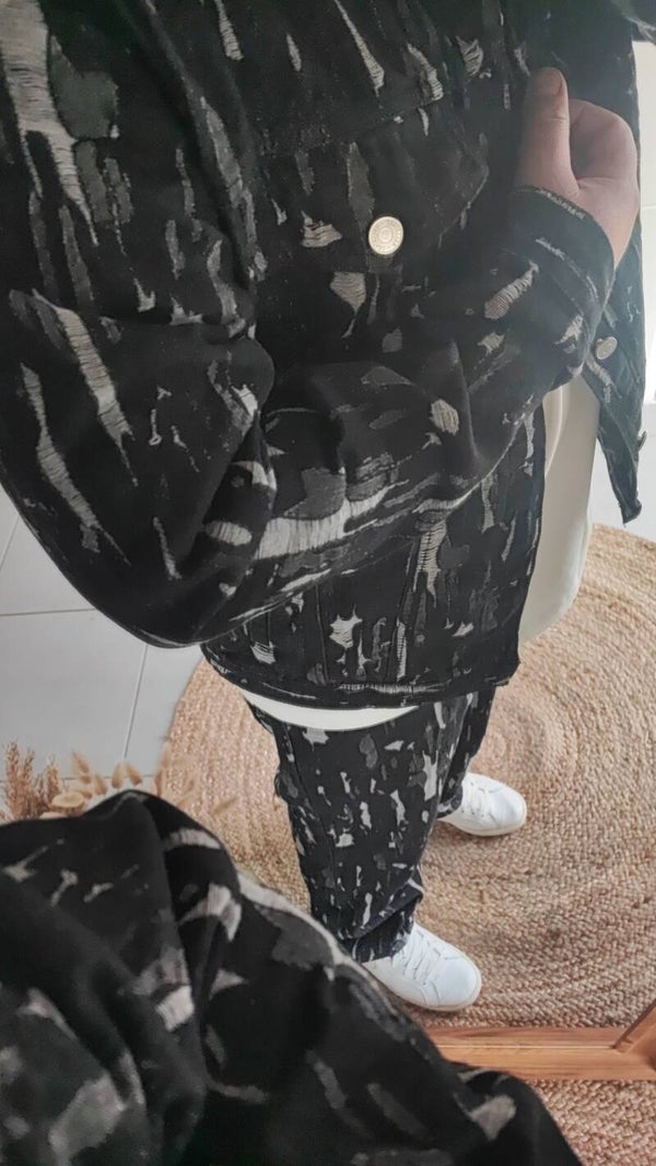 Ensemble en jean avec griffure sur la totalité, ce qui donne un style original et urbain, avec une pointe de classe.