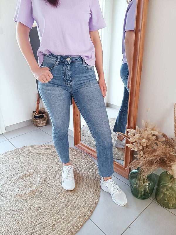 ✨ jean coupe droite en longueur 7/8 . Effiloché sur le bas . Son confort fera toute la différence ✨