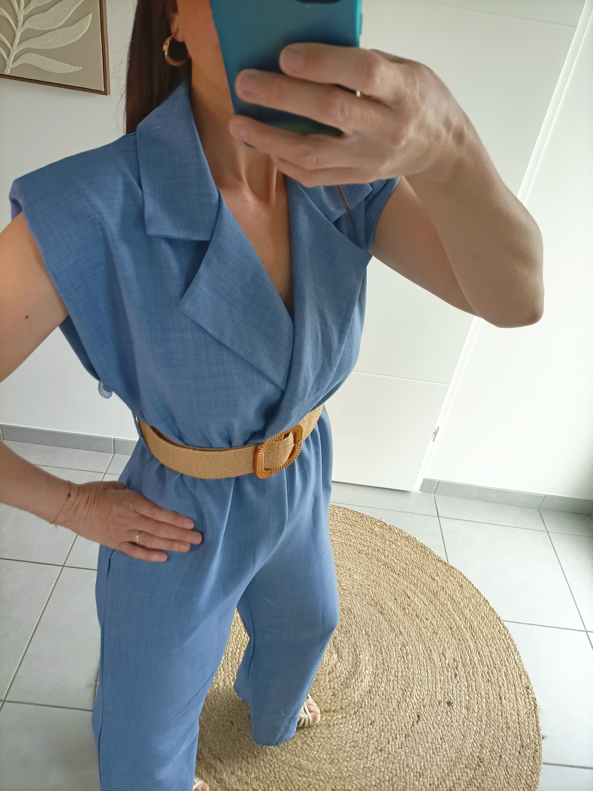 ✨Combi pantalon avec taille élastique et ceinture . Très classe et élégante avec ses épaulettes et son col blazer  .✨