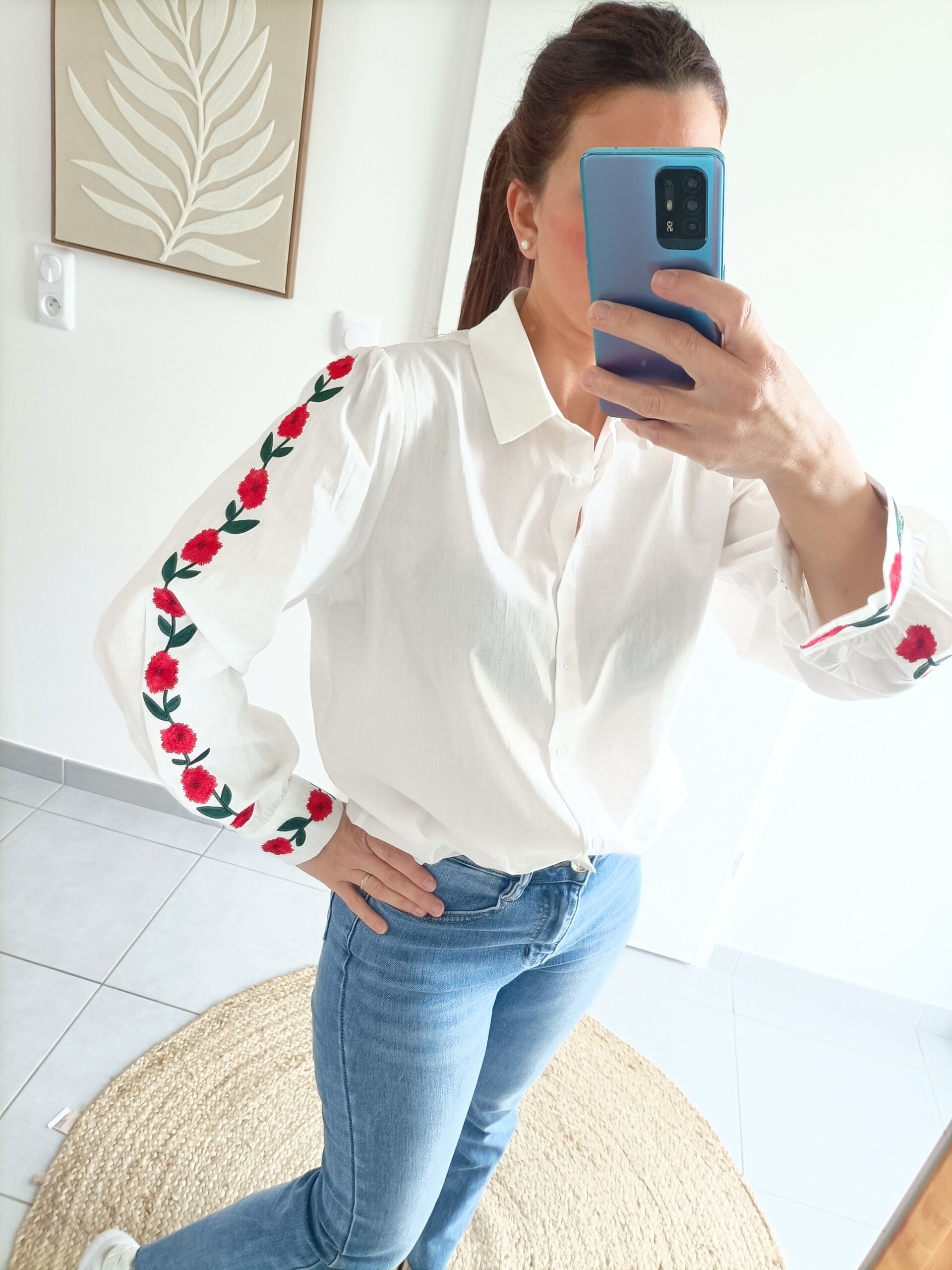 ✨ chemise blanche avec broderie fleuri sur la longueur des manches . ✨