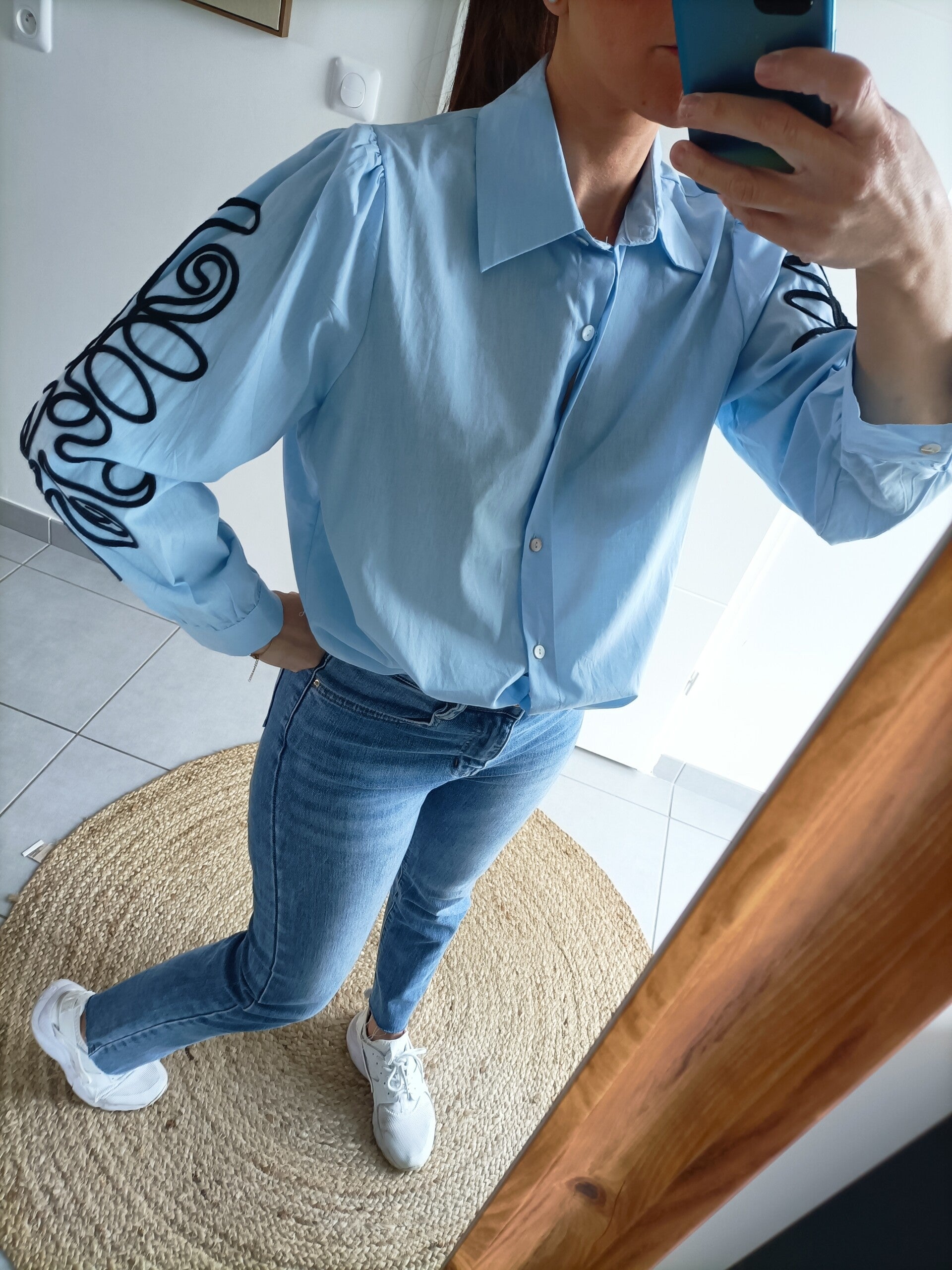 ✨ chemise bleu ciel avec broderie noir sur la longueur des manches . ✨