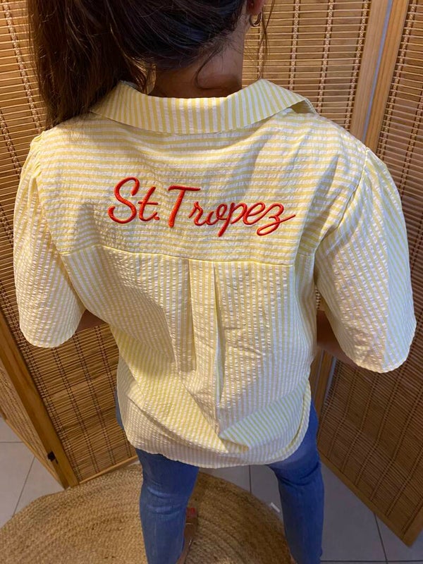 Chemise 100%coton , manche courte plus longue sur le dos très élégante avec sa broderie rouge