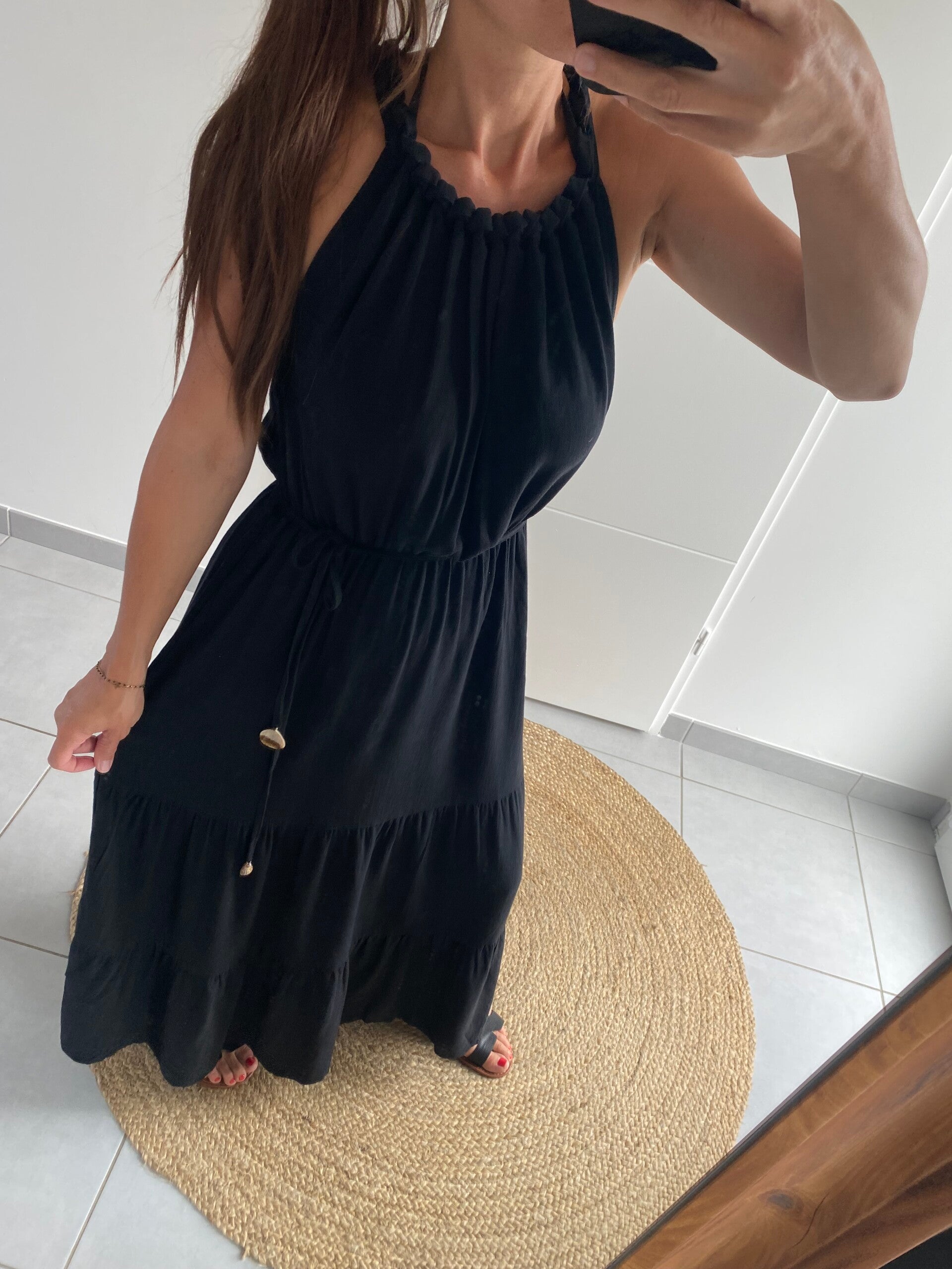 Robe style jupon en lin et viscose . Magnifique avec son col ras de cou et sa ceinture avec coquillage . Élastique à la taille .