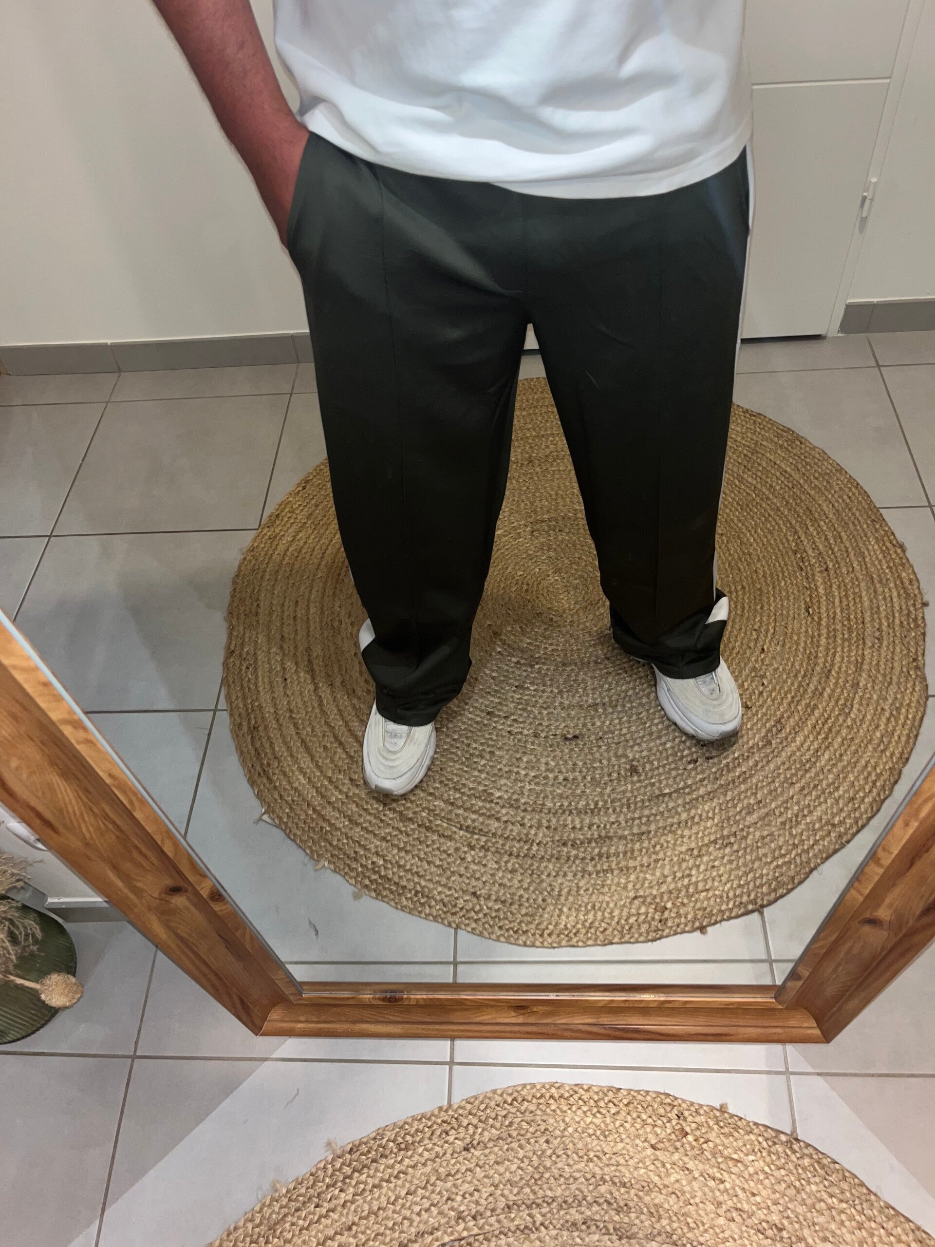 Bas de jogging, coupe large, couleur kaki et ligne blanche sur les côtés et lignes sur le devant léger et agréable aux porter. Parfait pour la saison.